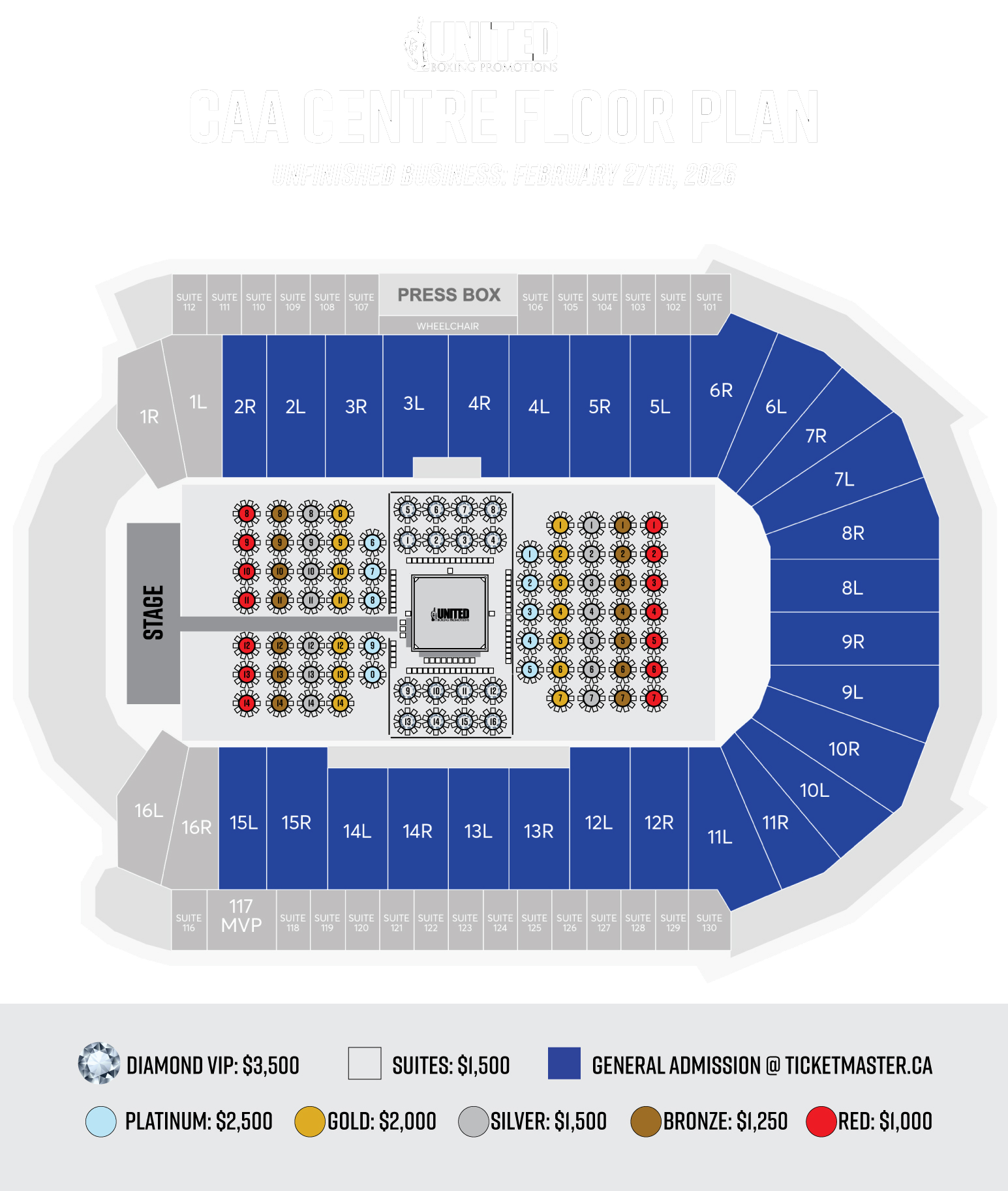 CAA Centre : Brampton : February 27, 2026 Click the layout to enlarge Table pricing Diamond Table $3,500 Platinum Table $2,500 Gold Table $2,000 Suite $1,500 Silver Table $1,500 Bronze Table $1,250 Red Table $1,000 Single Seat Pricing DiamondTable Seat $350 Platinum Table Seat $250 Gold Table Seat $200 Silver Table Seat $150 Bronze Table Seat $125 Red Table Seat $100 Items marked with an * are required Ticket Order Form: Name Email Phone VIP Level Diamond Table PlatinumTable Gold Table Silver Table Suite Bronze Table Red Table Individual DiamondTicket (s) Individual Platinum Ticket (s) Individual Gold Ticket (s) Individual Silver Ticket (s) Individual Bronze Ticket (s) Individual red Ticket Message PROMO Code Notify me about upcoming events and promotions Submit Order After you submit your order, we will be in touch. Please ensure that your contact details are correct.